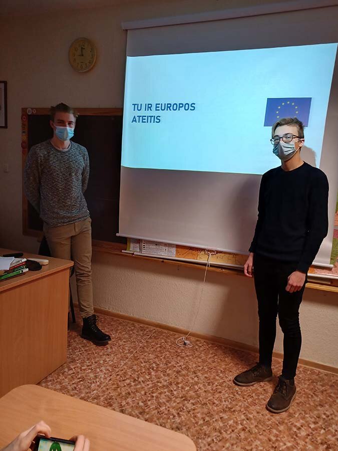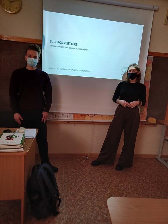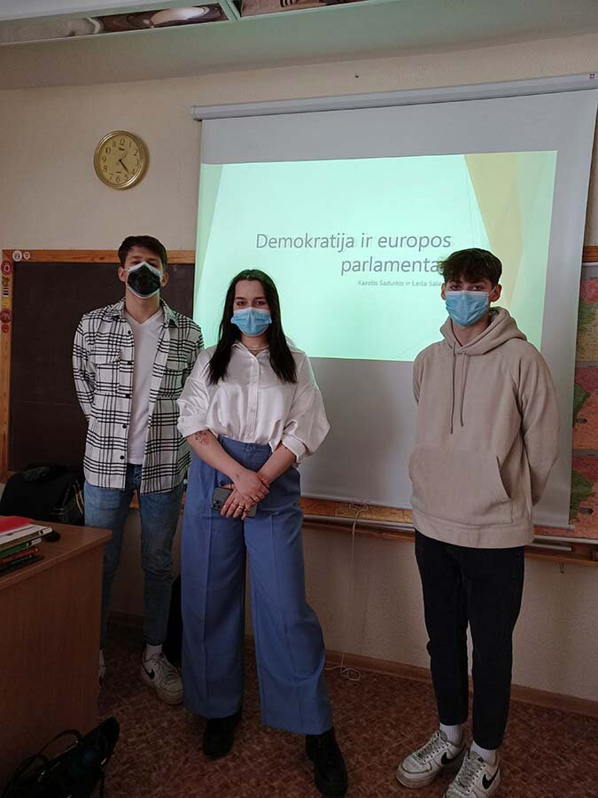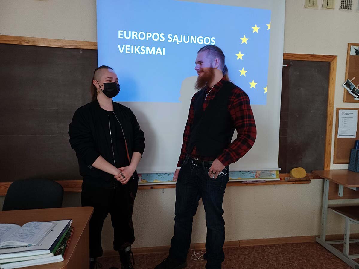 Trečiokai antrokus supažindino su ES vertybėmis, ES struktūra, jaunimo galimybėmis Europos Sąjungoje. Pristatę pasirinktą temą trečiokai pabaigoje organizavo mini protmūšį. Antrokai ne tik plačiau susipažino su ES veikla, bet ir smagiai pažaidė Kahoot, o nugalėtojai gavo apdovanojimus.