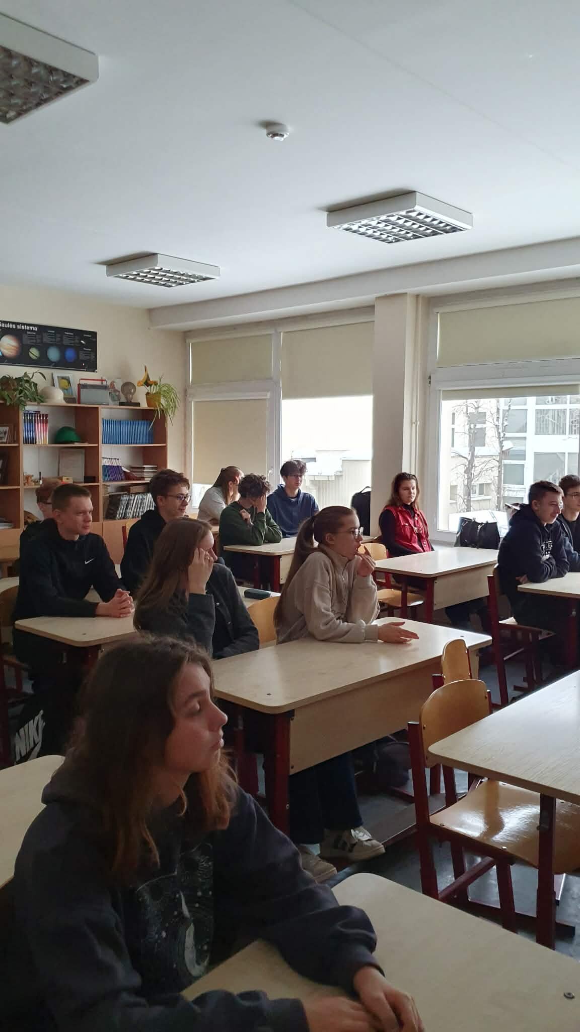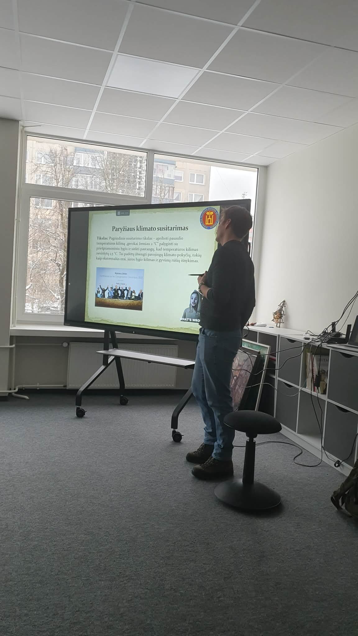 1e klasės mokiniai dalyvavo integruotoje geografijos ir fizikos projektinėje veikloje, skirtoje aktualiai temai „Tvarumas šiandien – saugi ateitis rytoj“. Veiklos metu mokiniai ne tik žiūrėjo filmą „Diena po rytojaus“, bet ir aktyviai diskutavo apie klimato kaitos priežastis, pasekmes bei žmogaus atsakomybę už planetos ateitį. Savo žinias jie gilino klausydamiesi Vilniaus pilių valstybinio rezervato direkcijos edukatoriaus Marijaus Mažūno paskaitos „Klimato kaita Lietuvoje“, kurioje buvo aptarti mūsų šalies aplinkos pokyčiai ir galimi jų sprendimo būdai.