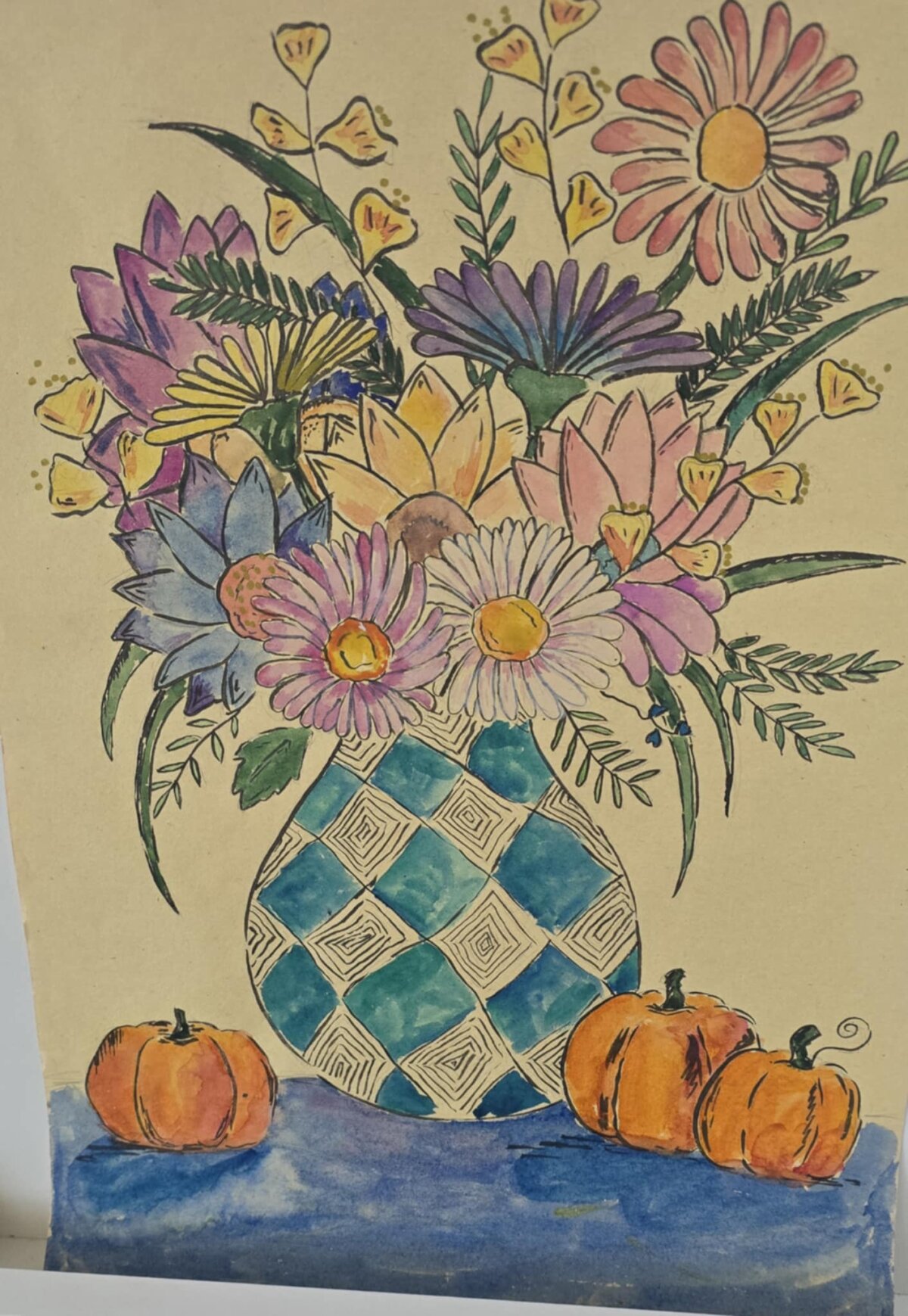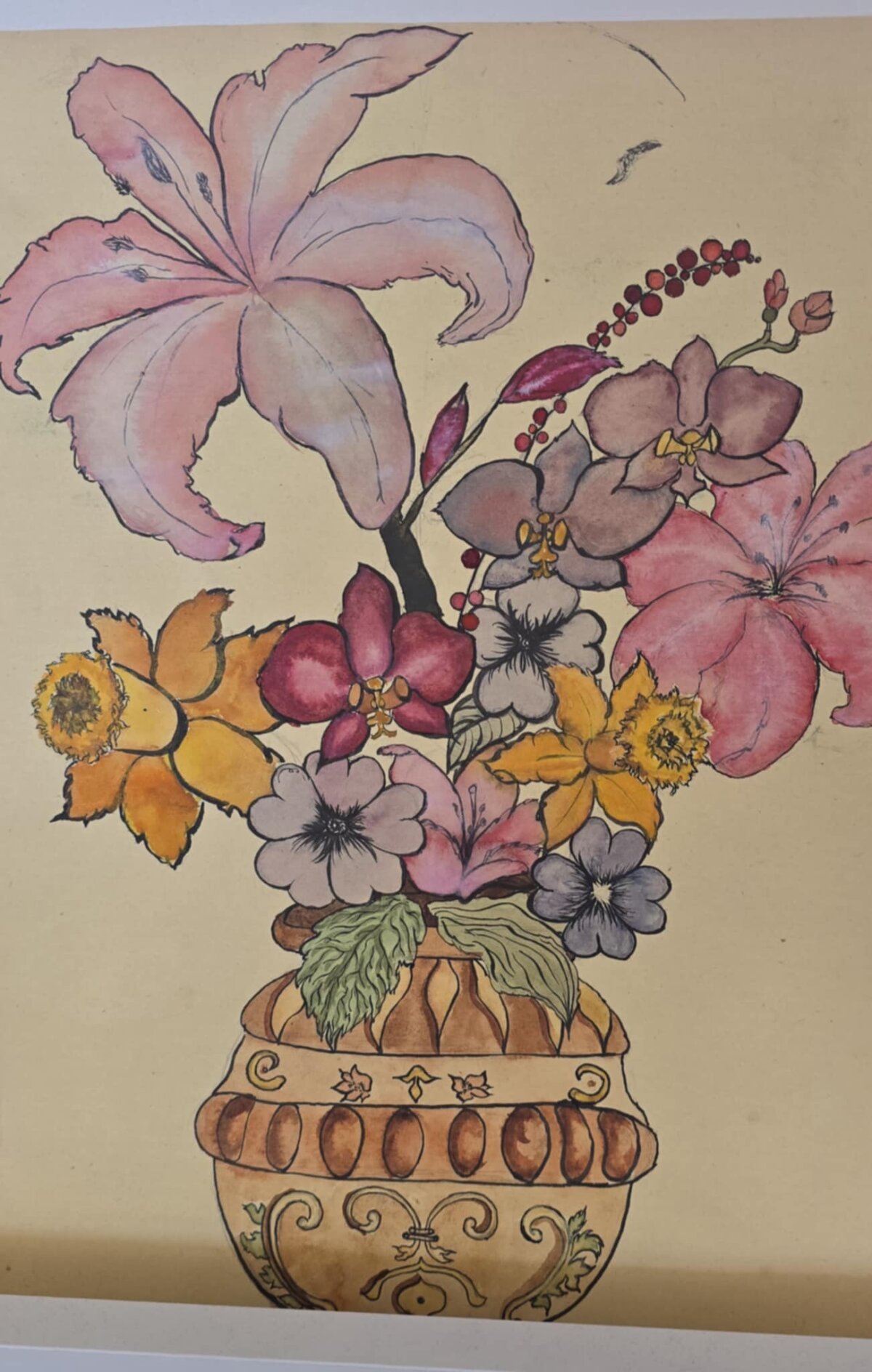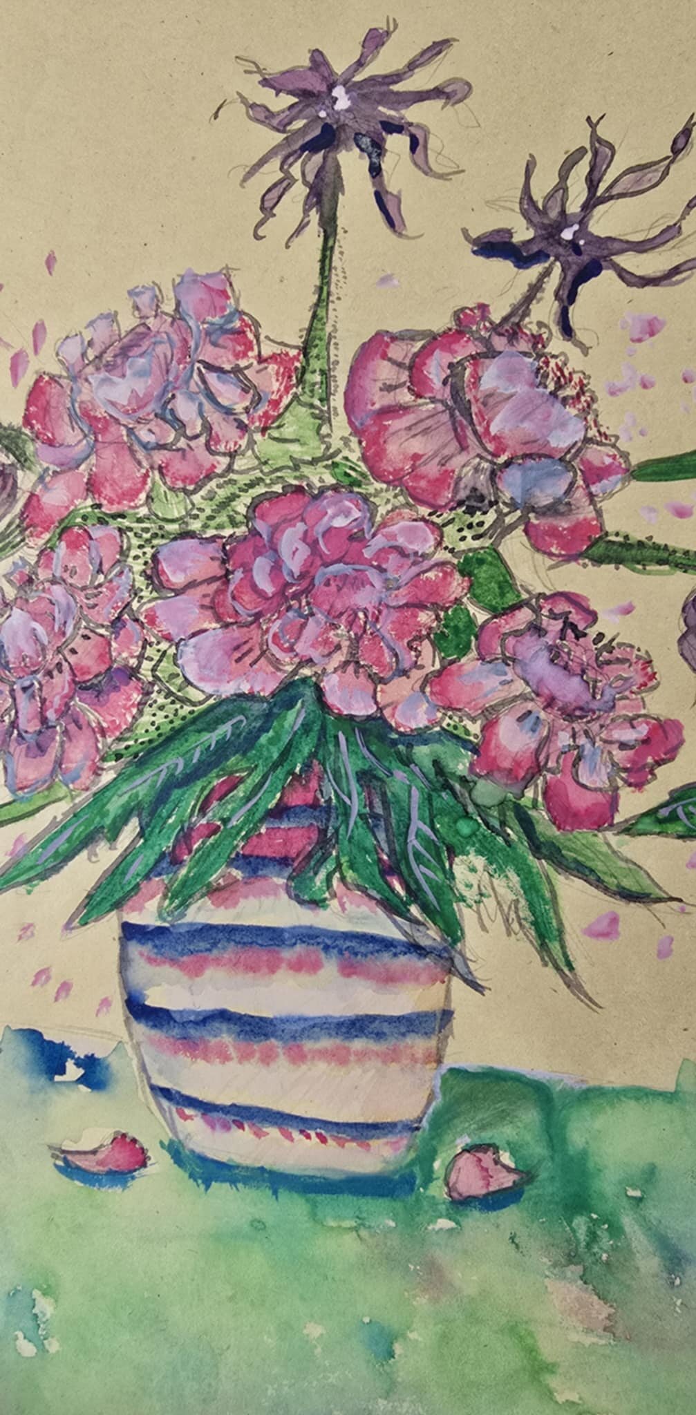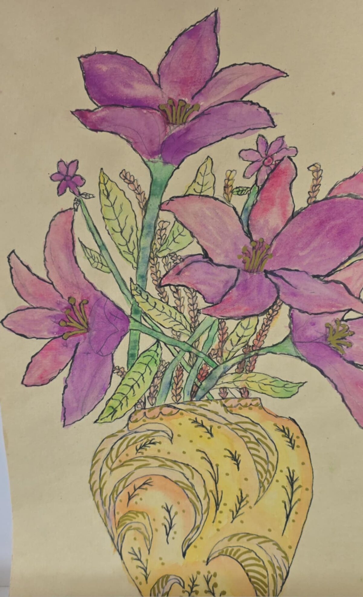3 klasės gimnazistų tapybos darbai - barokiniai natiurmortai, sukurti akvarelės ir sumi-e tapybos stiliumi. Šiuose kūriniuose mokiniai tyrinėjo skirtingų kultūrų meno dialogą: flamandy baroko natiurmortų puošnumą ir japonų akvarelinės tapybos subtilumą. Įkvėpimo šaltiniu tapo baroko laikotarpio flamandų menininkų darbai, kuriuose gėlės komponuojamos prabangiose vazose, kuriamos sodrios, turtingos kompozicijos. Analizuodami šiuos kūrinius mokiniai sėmėsi idėjų ir kūrė savo gėlių kompozicijas. Darbuose įvairios gėles, tarsi ką tik nuskintas iš barokinio sodo gėlyno. Kiekvienas žiedas, lapas ar stiebelis tampa svarbia kompozicijos dalimi. Nors kompozicijų idėja remiasi baroko puošnumu, jų atlikimas artimas japonų akvarelei ir sumi-e tapybai – lengvi, skaidrūs potėpiai, subtilios spalvų dermės ir dėmesys kiekvienai detalei.3 klasės gimnazistų tapybos darbai - barokiniai natiurmortai, sukurti akvarelės ir sumi-e tapybos stiliumi. Šiuose kūriniuose mokiniai tyrinėjo skirtingų kultūrų meno dialogą: flamandy baroko natiurmortų puošnumą ir japonų akvarelinės tapybos subtilumą. Įkvėpimo šaltiniu tapo baroko laikotarpio flamandų menininkų darbai, kuriuose gėlės komponuojamos prabangiose vazose, kuriamos sodrios, turtingos kompozicijos. Analizuodami šiuos kūrinius mokiniai sėmėsi idėjų ir kūrė savo gėlių kompozicijas. Darbuose įvairios gėles, tarsi ką tik nuskintas iš barokinio sodo gėlyno. Kiekvienas žiedas, lapas ar stiebelis tampa svarbia kompozicijos dalimi. Nors kompozicijų idėja remiasi baroko puošnumu, jų atlikimas artimas japonų akvarelei ir sumi-e tapybai – lengvi, skaidrūs potėpiai, subtilios spalvų dermės ir dėmesys kiekvienai detalei.